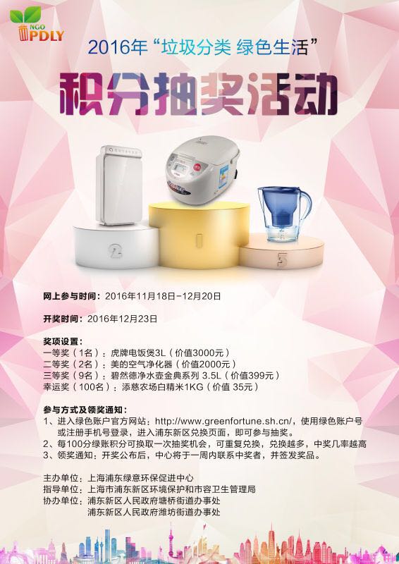 12月23日,在20名来自新区各城管署、街道和居委代表的见证下,浦东新区2016年度“垃圾分类 绿色生活”积分抽奖活动圆满落幕。
