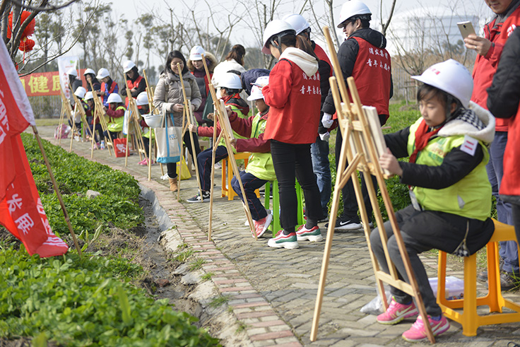 活动现场,来自浦发集团的志愿者们为樱花树林除草、浇水、施肥,看着自己亲手种下的小树茁壮成长,20名小天使们用手中的画笔绘画出心中的美丽家园,鲜艳的色彩、动人的场景,志愿者们