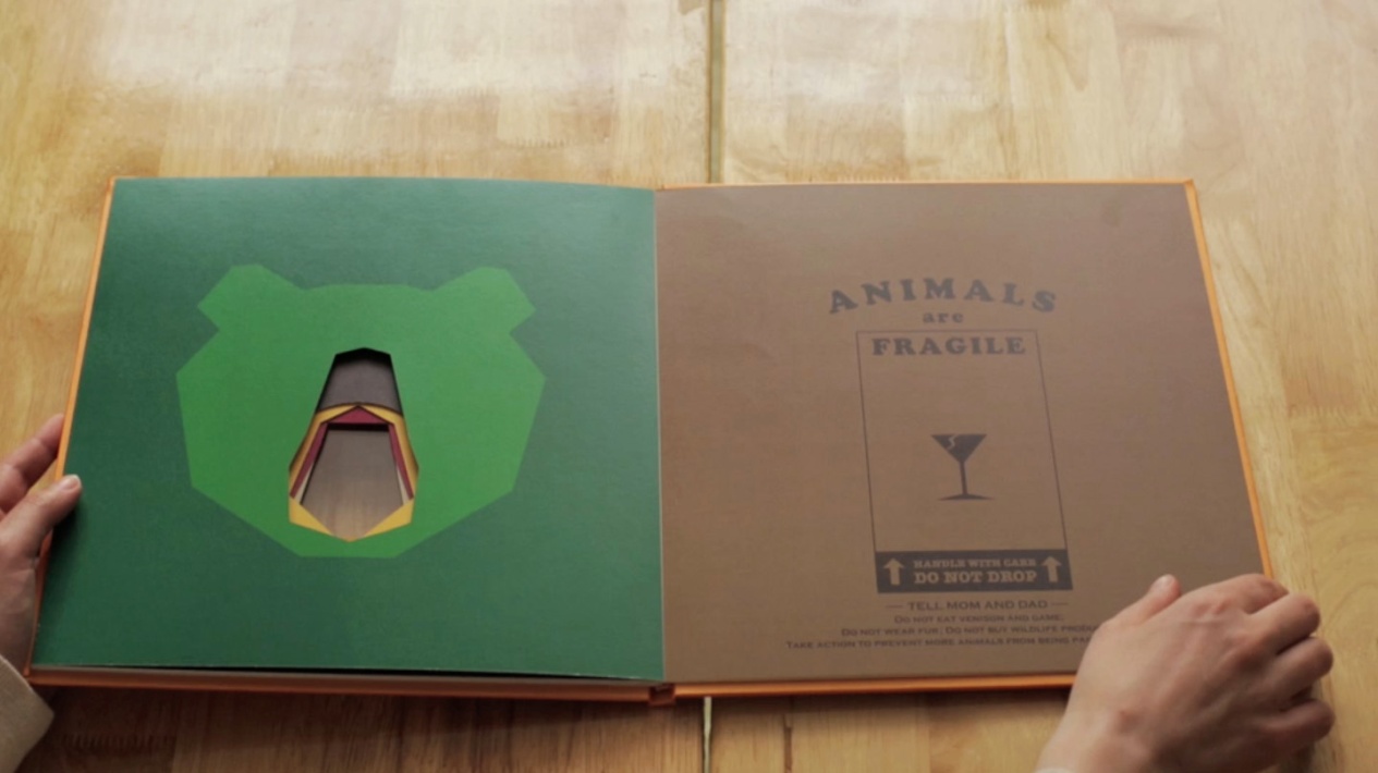 大人思维已经根深蒂固,小孩子的思想更易改变,创意人员选择借孩子之口,来改变大人行为,并采用了小孩子喜欢的沟通方式——绘本书,来传播这个观点。绘本书集合了7个已经灭绝的动物,共用一个易碎品标志形状的鼻子,巧妙有趣地传递出“动物也是易碎品”,并号召孩子劝告父母不要食用野味、不要购买皮草及野生动物制品。